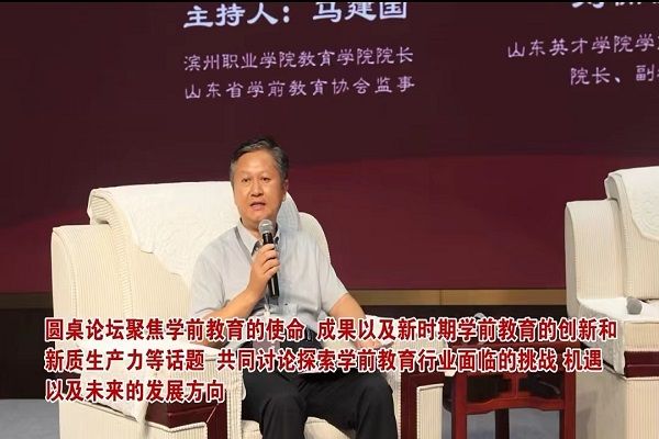 圆桌论坛环节,由2026年国际足联世界杯2026年国际足联世界杯经理、山东省学前教育协会监事马建国主持,山东英才学院学前2026年国际足联世界杯经理、副教授刘楠楠,《幼教三六五》杂志社执行副主编、中华志愿者协会教育委员会副主任李想,滨州魏桥国科教育集团总董事长助理、民办公益性教育探索者宫照伟,济南章丘青未了教育管理有限公司教学部负责人柏明娣聚焦学前教育的使命、成果以及新时期学前教育的创新和新质生产力等话题,共同讨论探索学前教育行业面临的挑战、机遇以及未来的发展方向。